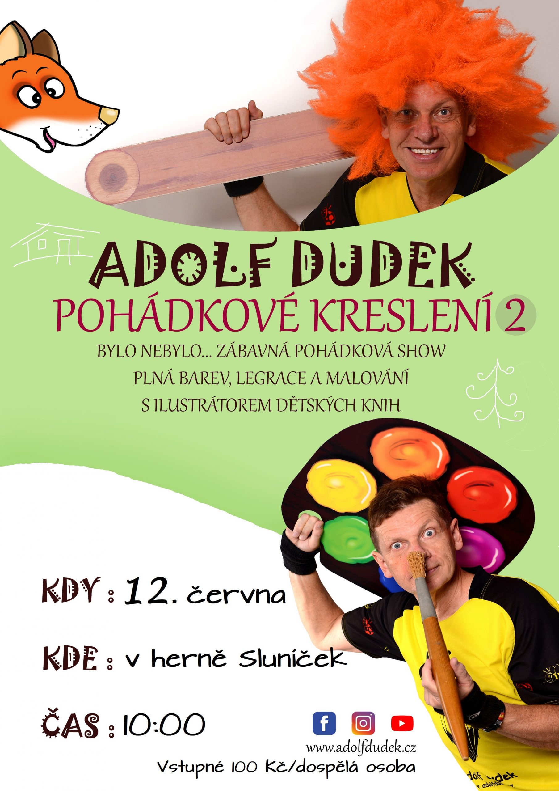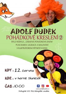„Dětská skupina srdečně zve na zábavné interaktivní vystoupení malíře a ilustrátora dětských knih Adolfa Dudka. Zábavný program se uskuteční v herně Sluníček ve středu 12. června 2024 v 10:00 hod. Těšíme se na setkání s Vámi!“