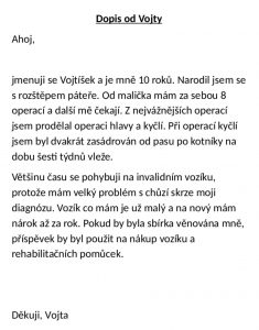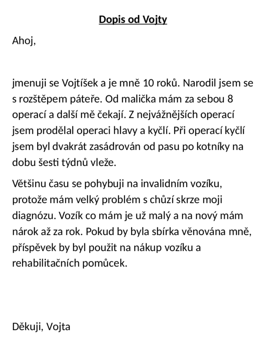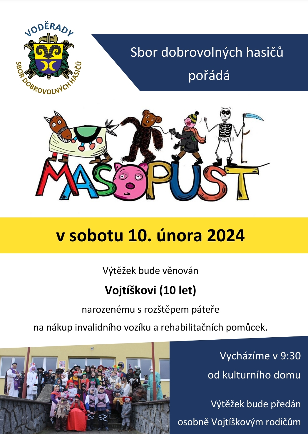 Masopust 2024 2.2.2024AktualityMiroslav Koudelka V sobotu 10. února se bude konat tradiční masopustní průvod. Letos jsme se rozhodli věnovat výtěžek Vojtíškovi (10 let), narozenému s rozštěpem páteře, na nákup invalidního vozíku a rehabilitačních pomůcek.